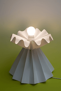 Hana Wave is one of the new "Curves" collection by Moshi-Moshi. Composed by curved and angular folds composition, Different from the conventional Origami technique. The shape is inspired by the Lily flower and the word Hana in Japanese means Flower. It has electrical components of embossing in copper. This lamp can be supported in 2 positions and can also be used as a hanging lamp shade.